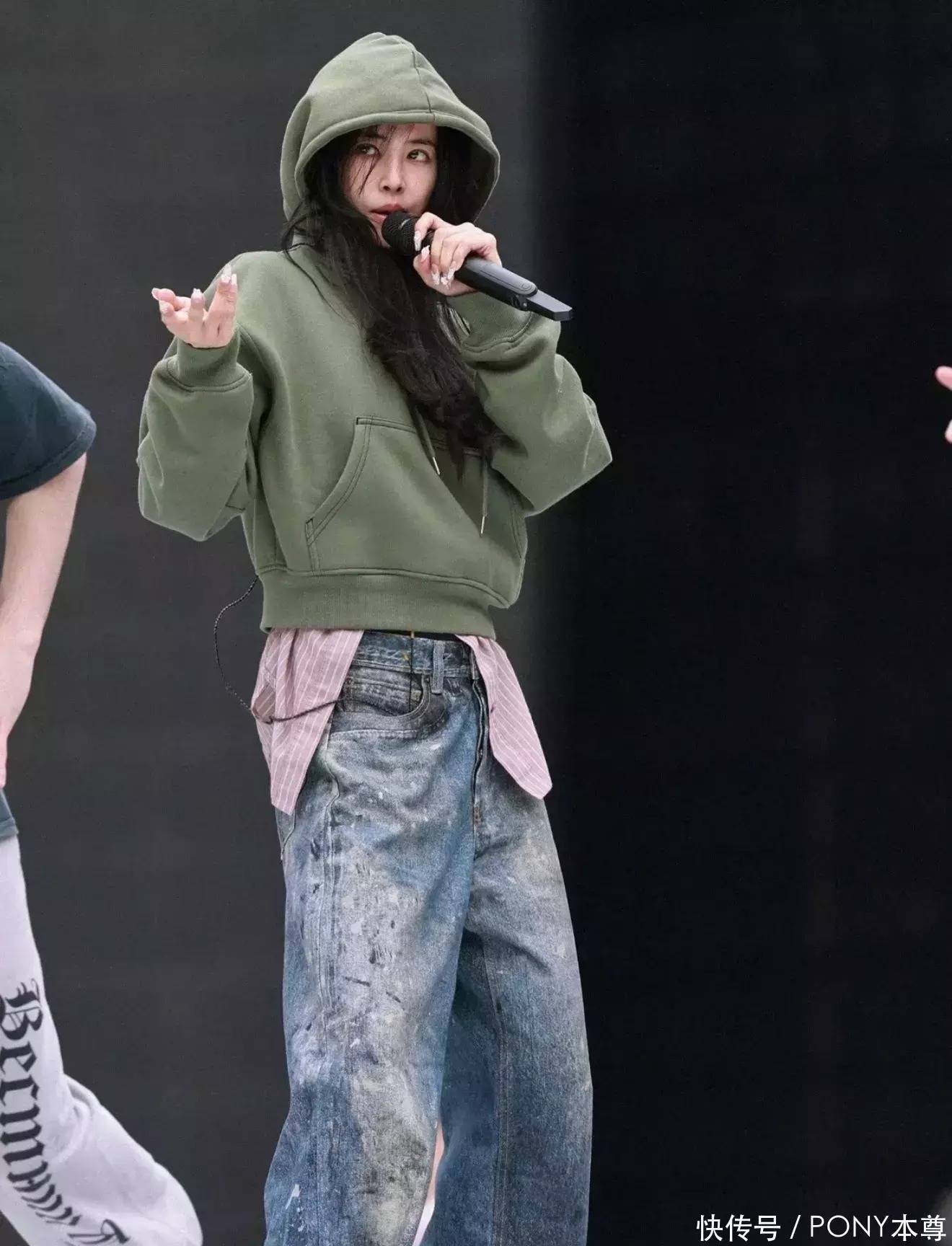 1、咸菜绿色卫衣搭配维捏牛仔裤,端淑天才!