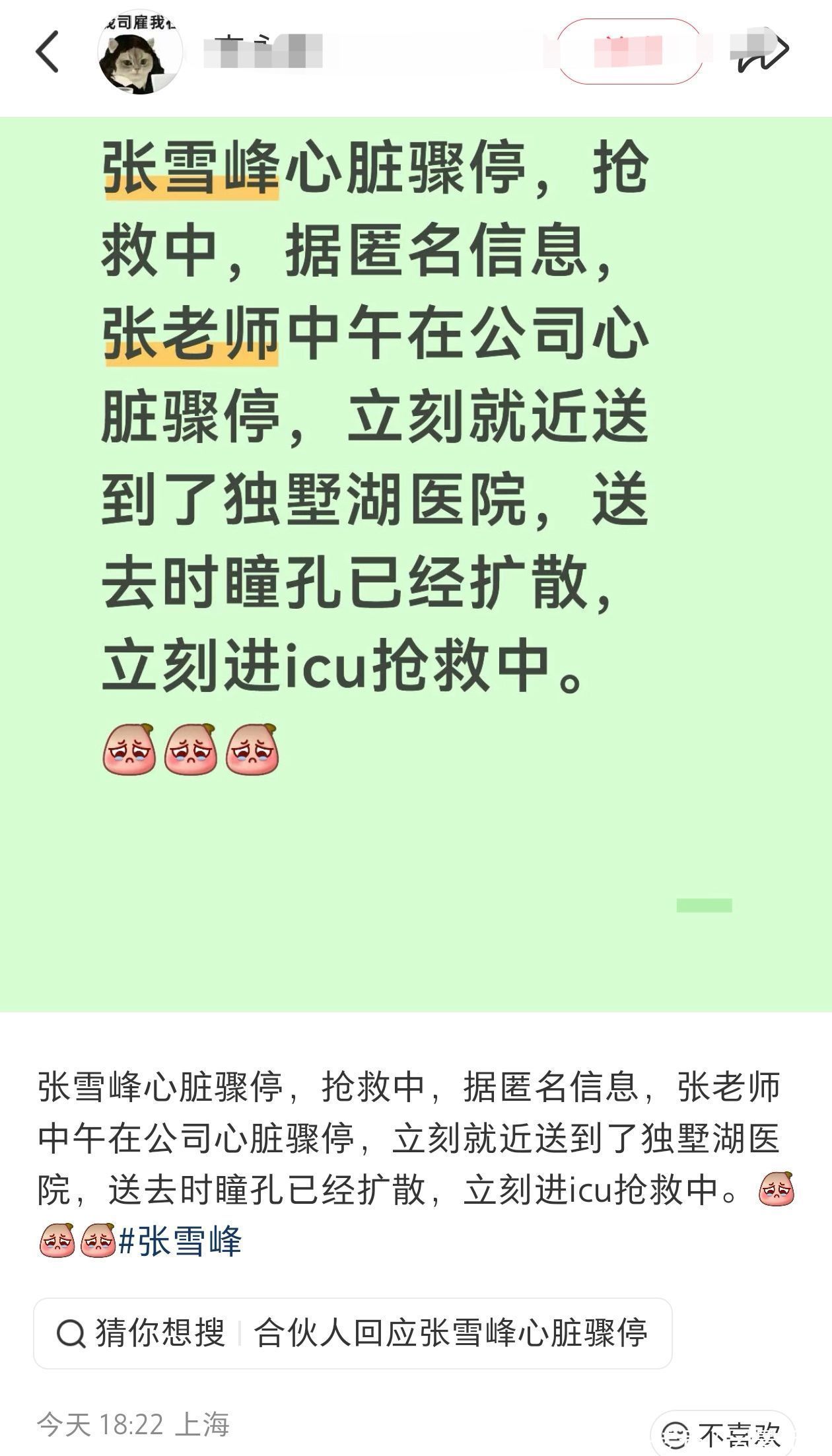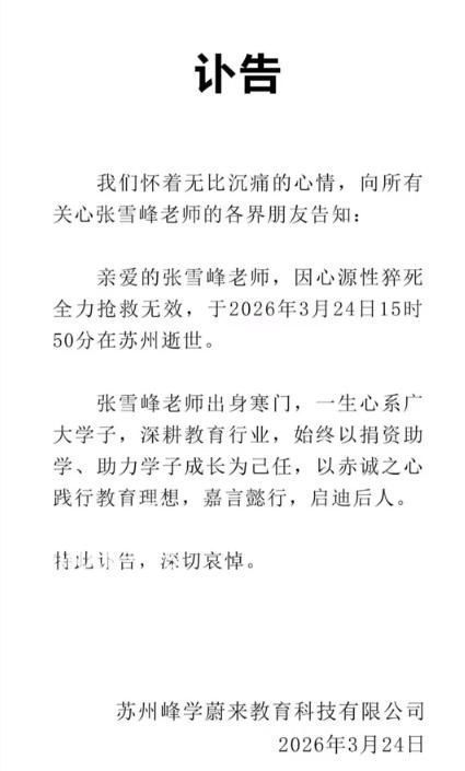 3月24日下昼,多方信源证实,张雪峰于苏州住所内的跑步机上突发急性心源性暴毙,被赶紧转送至苏州大学从属独墅湖病院ICU抢救。