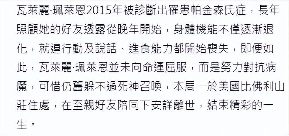 比奇迹滑坡更令东谈主心碎的,是她暮年的旷费与疲倦。早年蕴蓄的片酬本足以撑持优雅养老,却在2015年被确诊帕金森病透顶改写——震颤、僵直、步态冻结等症状逐年加重,连端起一杯水都成为需要全身配合的沉重交易。