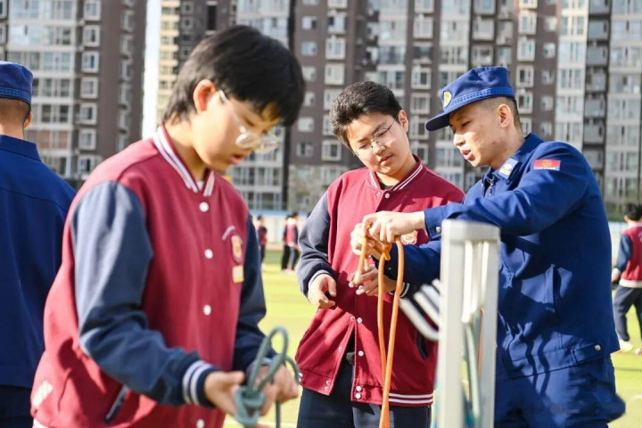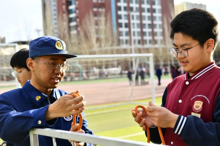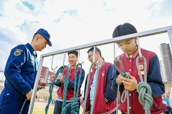 “双平结不错链接两根绳索,越拉越紧,越拽越牢。”消防员一边拆解一边示范,行为娴熟畅达。学生们目不邪视,有的忍不住伸入手指随着比划。