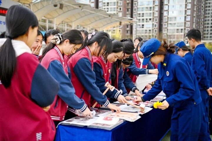 非遗消防文创展示区相同东谈主头攒动。学生们在消防员率领下,将宣纸覆上特制拓版,喷水、吸干、上墨、拓印,一幅幅鲜红的消防主题拓印作品出身。全球注重翼翼地举着,受宠若惊。
