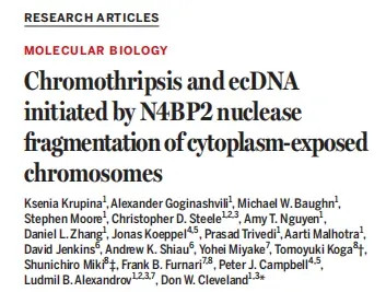 KRUPINA K, GOGINASHVILI A, BAUGHN M W, et al. Chromothripsis and ecDNA initiated by N4BP2 nuclease fragmentation of cytoplasm-exposed chromosomes[J]. Science, 2025. DOI: 10.1126/science.ado0977.