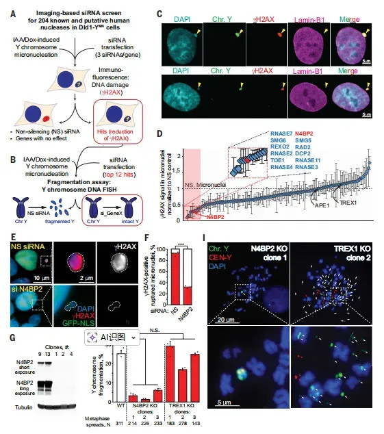 在初筛中,每个核酸酶基因被3条沉寂siRNA靶向,设非千里默siRNA(NS)为阴性对照、wortmannin(γH2AX变成扼制剂)为阳性对照;复筛针对初筛top 12候选基因,要点进修N4BP2敲低组与对照组的Y染色体无缺性各异。为确证因果性,讨论进一步成就CRISPR-Cas9介导的N4BP2纯合敲除(KO)细胞系,并援助TREX1敲除手脚平行对照。扰乱按序包括:使用IAA/DOX领导微核变成、nocodazole惩办阻断有丝永诀促进微核产生、甲氨蝶呤(MTX)领导DHFR基因扩增以模拟ecDNA生成。