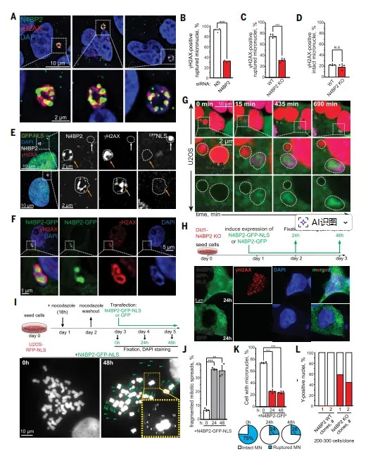 讨论数据明确指向N4BP2是微核内DNA毁伤的中枢实施者。在204个核酸酶的无偏筛选中,N4BP2敲低使微核γH2AX信号镌汰幅度最大,远超TREX1和APE1等既往候选分子(图1D)。而CRISPR-Cas9敲除N4BP2则饱和消亡了Y染色体片断化,证据其不成或缺性(图1H-I)。机制上,内源性N4BP2在破碎微核内变成液滴样焦点,与γH2AX共定位或相邻散播(图2A),活细胞成像骄傲其在微核破碎后15分钟内即投入(图2G)。这种空间共定位与功能必要性变成因果链条:N4BP2不领导微核破碎,但破碎后赶快实施切割,其核酸酶活性足以在24-48小时内使无缺微核丧失DNA履行物(图2K-L)。