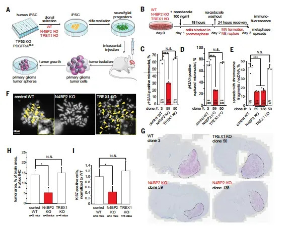 在领导型高等别胶质瘤模子中,N4BP2敲除使肿瘤面积减轻至野生型的23%(P<0.05),Ki67阳性细胞减少60%(图5G-H),微核DNA毁伤镌汰50%(图5C),ecDNA阳性永诀相从对照组32%降至敲除组8%(图5E)。这些数据共同指向N4BP2是督察肿瘤基因组不舒适性和增殖材干的要津因子。