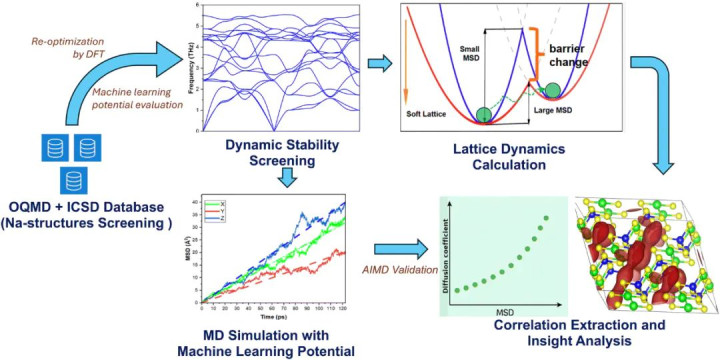 通过对 3903 个含钠结构的数据集进行高通量筛选,咱们树立了声子 MSD 与扩散系数之间的强正有关干系,提供了晶格能源学和离子传输之间的定量有关性。