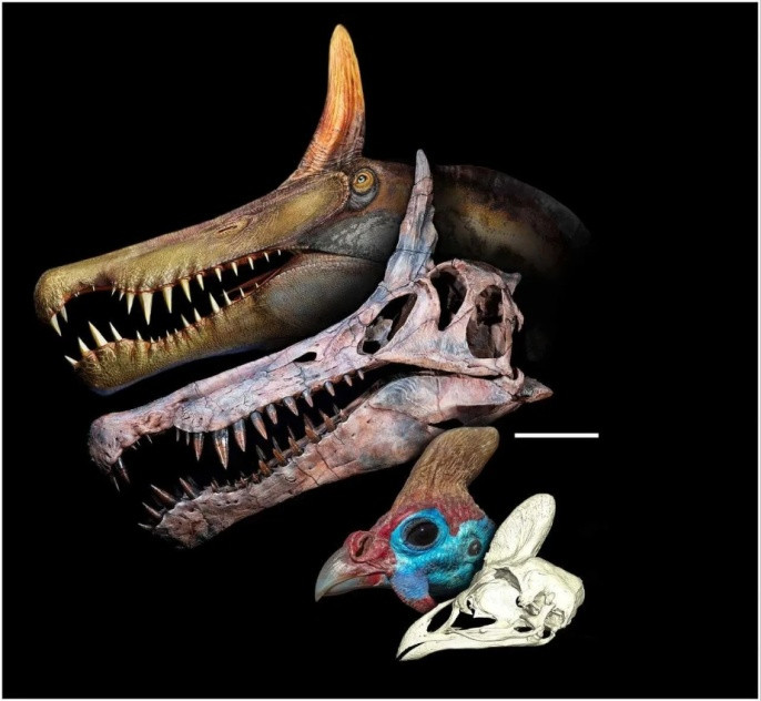 奇异棘龙和珍珠鸡的头骨及脑袋对比