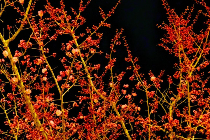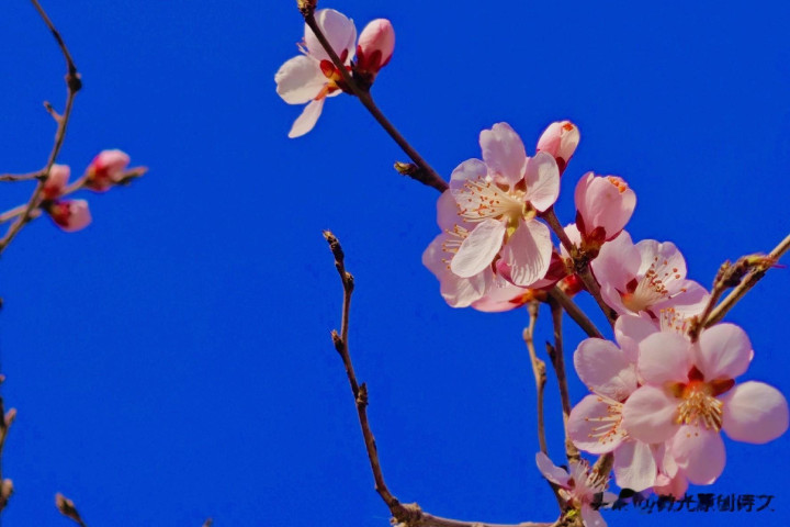 一树绯红的杏花开的华贵,仅仅它的花朵上,落了白皙无瑕的雪花。